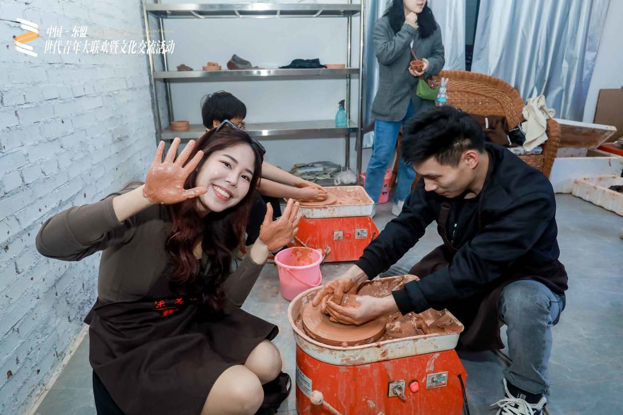 活动期间,参访团一行来到紫陶企业,近距离了解建水紫陶制作工艺。建水紫陶作为中国四大名陶之一,其独特的六大工艺——泥料制备、手工拉坯、湿坯装饰、阴刻阳填、高温烧制、无釉磨光已于2008年被列入世界非物质文化遗产名录。在紫陶制作体验环节,东盟青年们分组参与拉坯和湿坯装饰制陶过程。通过亲身实践,他们深入了解了紫陶制作的精妙之处。