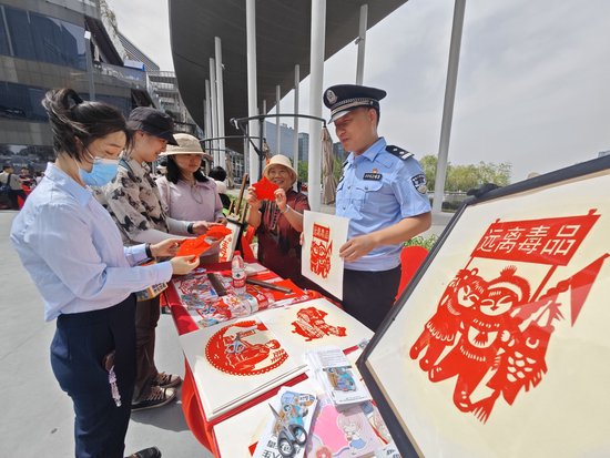 活动现场,禁毒办将禁毒知识与传统非遗文化相结合,推出了牡丹香包、灵宝剪纸、多彩纸雕、宋史风筝、木板年画、漆扇、糖画、蛋雕等非遗文化禁毒摊位,供广大市民观赏体验。